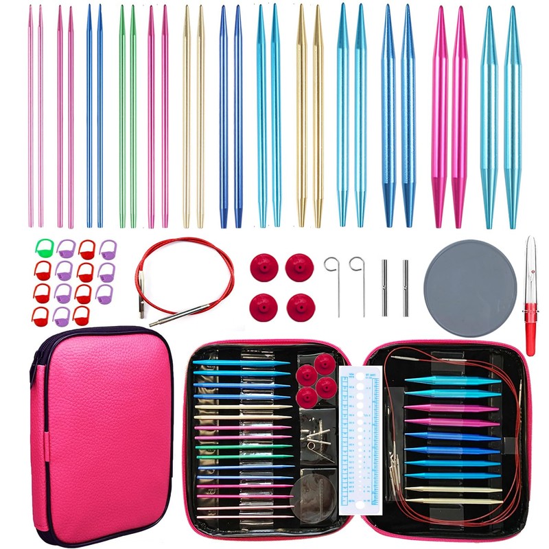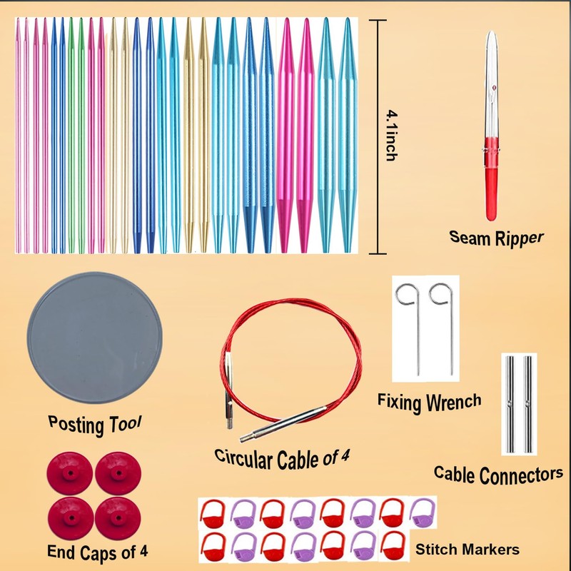 - Package Includes: 13 pairs of 4 inch aluminum circular needles and 4 cables of different lengths (11.8"/15"/17"/21.6") 4 pieces end caps,2 cable connectors,2 metal tightening keys and 1 posting tool,15 stitch markers,1 measure,1 Seam ripper,1 leather case.Beginners as well as experienced knitters need a comprehensive set of needles for their various projects.