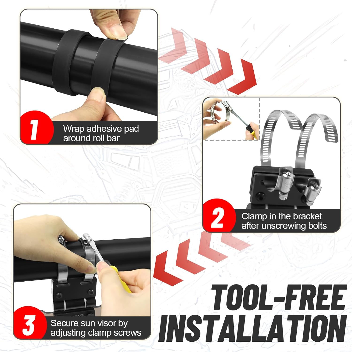 - 【Easy Installation】It is easy to complete installaion of the ranger sun visor. Wrapping adhesive pad around roll bar and then clamping in the bracket after unscrewing bolts, finally securing sun visor by adjusting clamp screws. You can choose to install it on driver side, passenger side or both side.