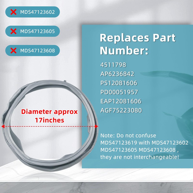 - 【Replaces Part Number】: Replacing the seal is the most effective maintenance for your washing machine. MDS47123619 gasket replaces AGF75223080, 4511798, AP6236842, PS12081606, EAP12081606.Note: Do not confuse MDS47123619 with MDS47123602 MDS47123605 MDS47123608, they are not interchangeable! Please check that the MDS47123619 washer door gasket you order matches your model before buying MDS47123619