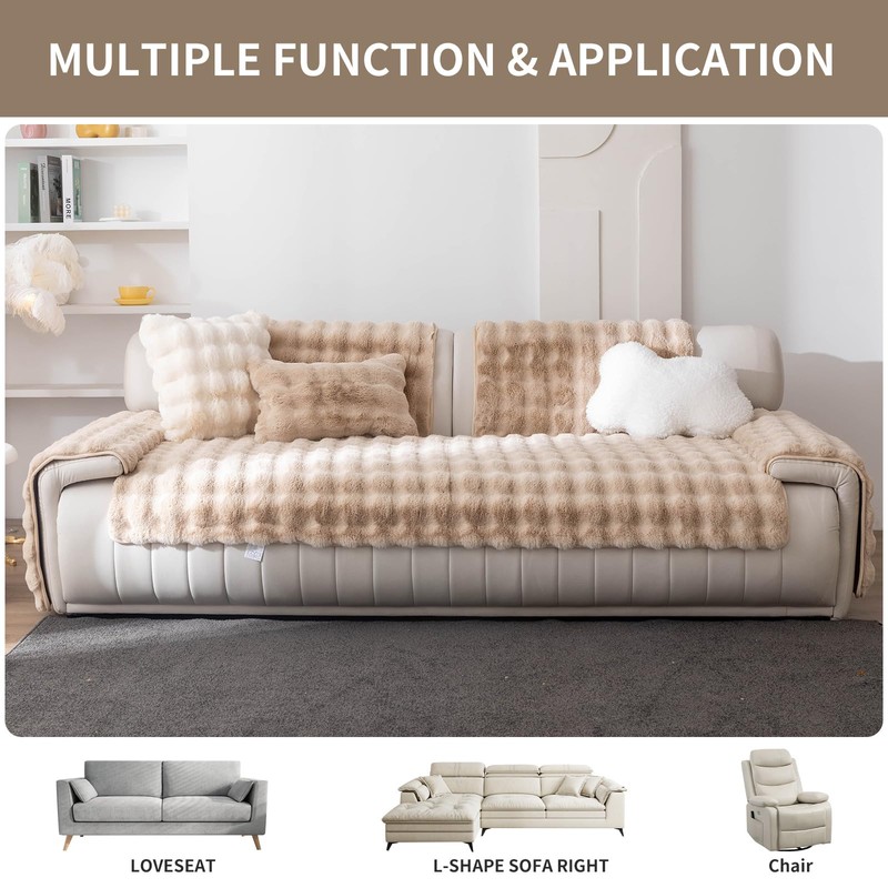 - [Warmth and Anti-Slip] Crafted from high-quality faux rabbit fur, the front side of bubble style sofa cover is densely tufted for softness and exceptional warmth, making your winter cozy. The back of plush couch cover side features anti-slip silicone particles to ensure better stability and prevent shifting.