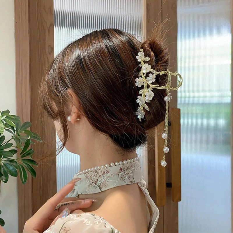 Jasmine Flower Claw Clip With Rhinestones Pearl Tassel Design - Metal Gold-1