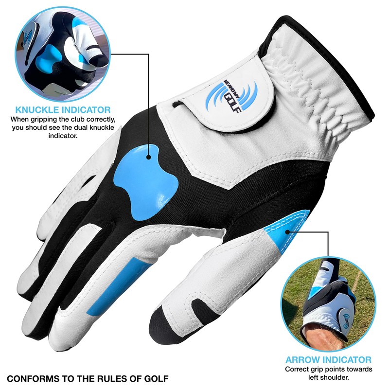 - Visual Indicators – Use the dual knuckle and arrow tip indicators on the glove to improve your grip technique. Allows clear visual indicators that your knucks and right shoulder alignment is correct.
