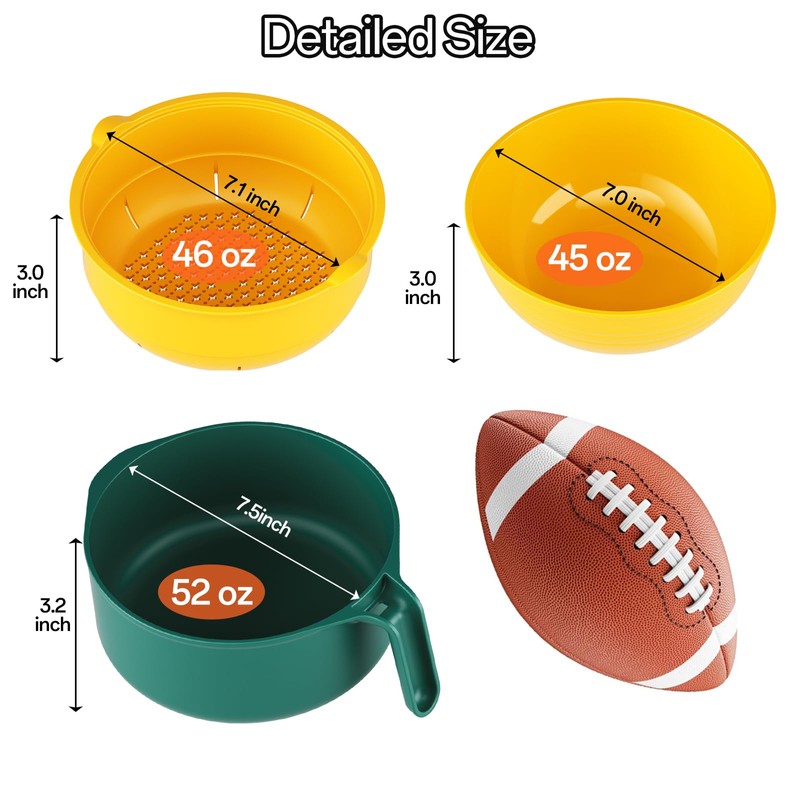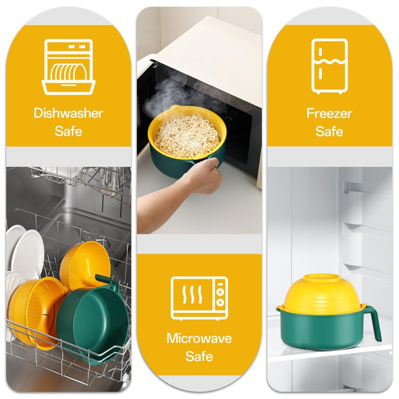 - Upgraded Handles Design: We reinforced and enlarged the big handle of noodle bowl, no afraid handle would bend, the bridge of the handle is sturdier. And we added a small handle opposite the large handle, so easier to hold with two hands after picking up the bowl out of the microwave. Also we added 2 handles on both sides of the drainer bowl, easy to lift out of the bottom bowl when it's full of recently boiling water.