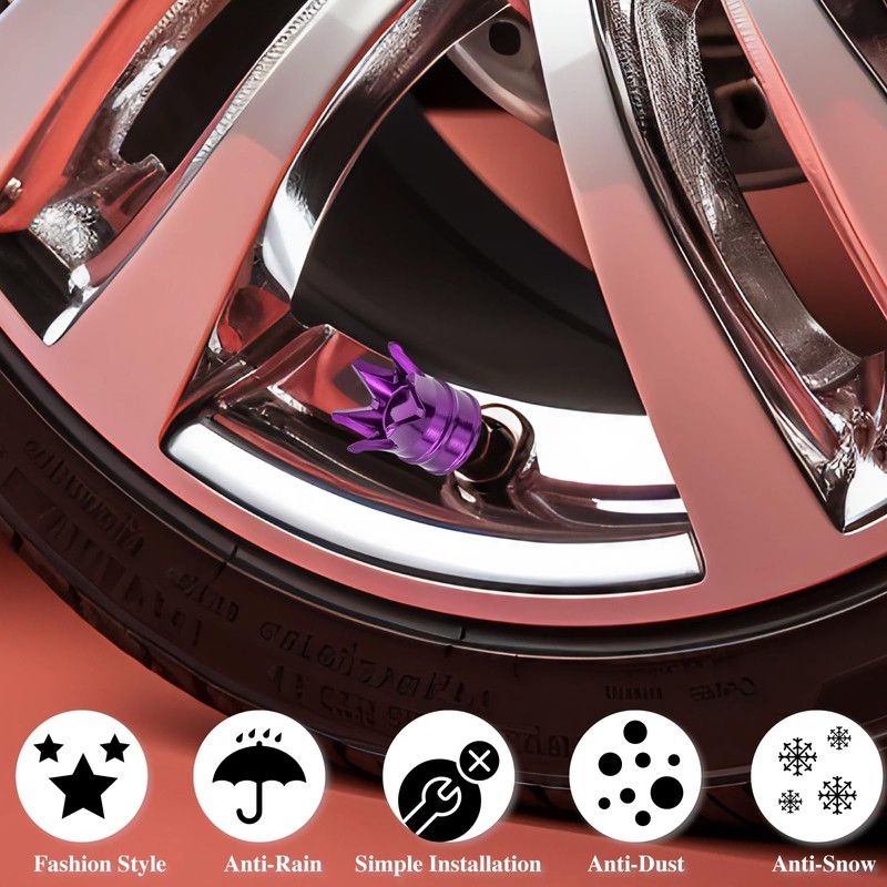 MEAJOO 4PCS Crown Style Tire Valve Stem Caps, Air Caps Cover, Aluminum Alloy Dustproof and Waterproof Valve Caps Cover fits Cars, Trucks, Bikes, Motorcycles, Bicycles Tire Caps(Purple)