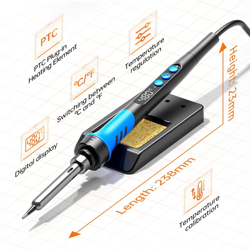 - Technical innovationThe soldering iron is upgraded to 90W high power, which can make the iron warm up quickly; this iron can adjust the temperature accurately, the temperature can be set flexibly to 180-480