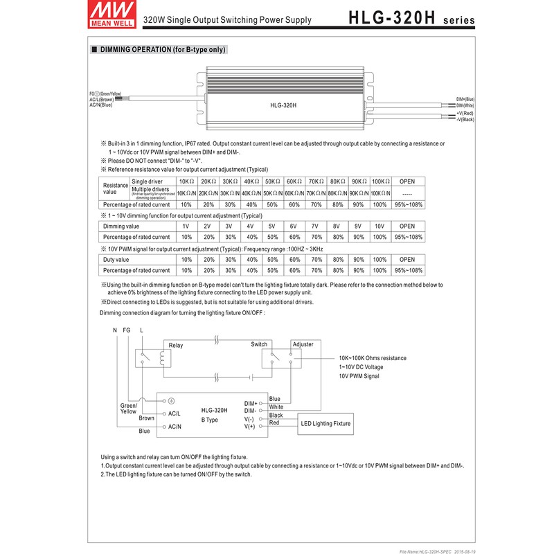 D-Type(option): IP67 rated. Timer dimming function, contact MEAN WELL for details (HLG-320H only)
