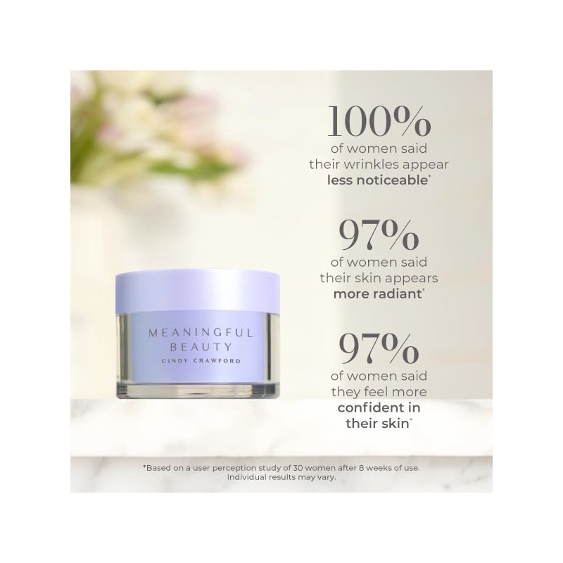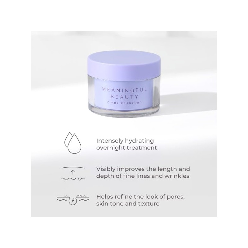 This intensely hydrating and gentle overnight treatment pairs the super anti-oxidant properties of our famous French melon with the acclaimed repairing performance of retinol. By encouraging skins own renewal process, this crme helps to improve overall texture and radiance, increase the look of firmness and elasticity and decrease the visible wrinkles around the eyes, mouth, and foreheadall while you sleep. Its key ingredients work both individually and collaboratively to deliver these great benefits. Retinol, a form of Vitamin A, helps to decrease the appearance of fine lines, wrinkles, and crows feet with continued use, to reveal visibly smooth overall texture and radiance. Melon Extract, a powerful antioxidant SOD (Superoxide Dismutase), helps to fight future damage from free radicals. Hexapeptide-9, a skin conditioning ingredient, helps to improve the appearance of skin firmness and reduce the length and depth of wrinkles. Proper moisturization and hydration are essential to maximizing your visible skincare results. Bring out ultimate skin radiance with Meaningful Beautys Overnight Retinol Repairing Creme, designed for all skin typescombination, normal, and dry. If for any reason you are dissatisfied or have an issue with your product, we will happily exchange your item for the same item, brand new, even if the bottle is empty. Please contact the manufacturer for more information. One exchange per customer. Ingredients: Water, Isononyl Isononanoate, Ethylhexyl Palmitate, Polyglyceryl-10 Distearate, Prunus Amygdalus Dulcis (Sweet Almond) Oil, Polysorbate 20, Dicaprylyl Maleate, Polymethyl Methacrylate, Polyacrylate-13, Castor Isostearate Succinate, Maltooligosyl Glucoside, Vegetable Oil, Isopropyl Myristate, Retinol, Cucumis Melo (Melon) Fruit Extract, Tocopherol, Ascorbyl Methylsilanol Pectinate, Hydrogenated Vegetable Oil, Hippophae Rhamnoides Oil, Elaeis Guineensis (Palm) Oil, Orchid Leaf/Root/Stem Extract, Olivine Extract, Soluble Collagen, C14-22 Alcohols, Jojoba Alcohol, Potassium Jojobate, Polyisobutene, Butylene Glycol, Hydrogenated Starch Hydrolysate, Magnesium Aluminum Silicate, Palmitoyl Proline, Palmitic Acid, Ethylene Brassylate, C12-20 Alkyl Glucoside, Hexapeptide-9, Hexylene Glycol, Ethylhexylglycerin, Sodium Palmitoyl Sarcosinate, Magnesium Palmitoyl Glutamate, Decarboxy Carnosine HCL, Disodium EDTA, BHT, BHA, Tocotrienols, Tetrasodium EDTA, Benzoic Acid, Phenoxyethanol, Caprylyl Glycol, Fragrance, Orange 4, Red 40 Meaningful Beauty Beyond is an evolutionary new line of next generation skincare products by Meaningful Beauty- Cindy Crawford and features the youth molecule isolated from rare melons grown in the South of France.