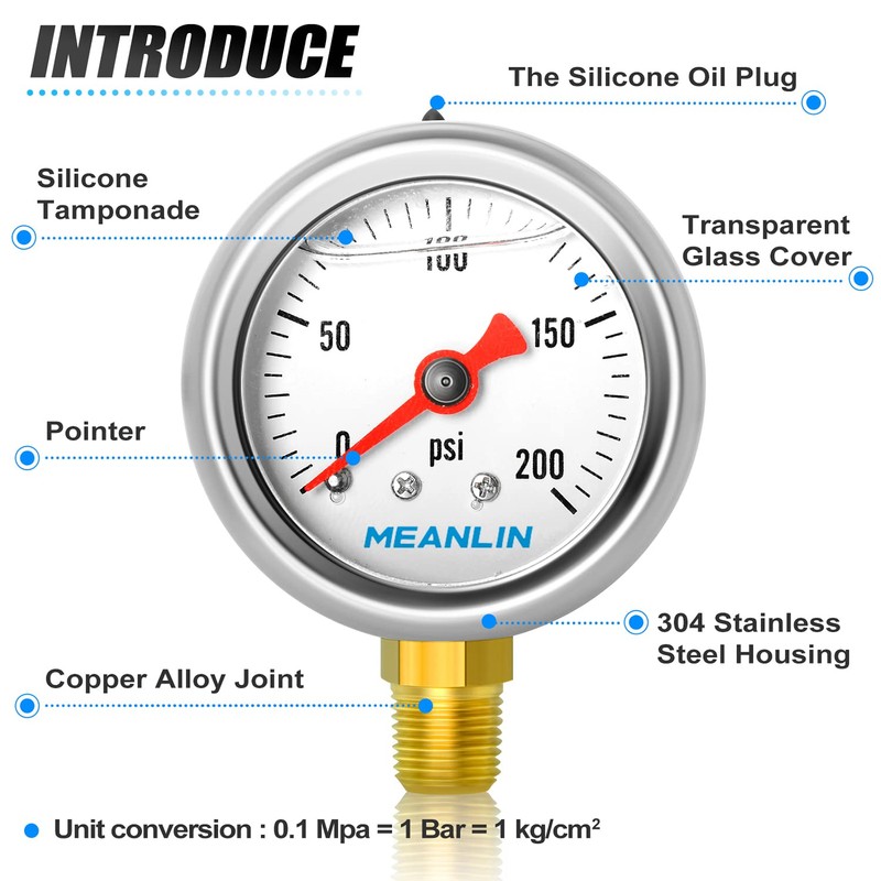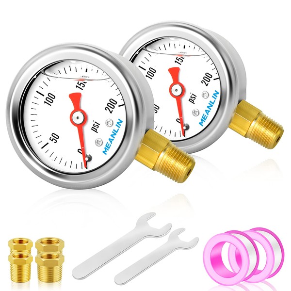 MEANLIN MEASURE 2pcs 0~200Psi Stainless Steel Liquid Filled, 1/8" NPT 1.5" Glycerin Filled Pressure Gauge, Water Oil Air, Lower Mount, with 1/8" x 1/4" NPT and 1/8" x 3/8" NPT Hex Bushing