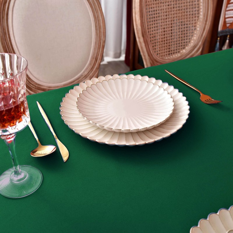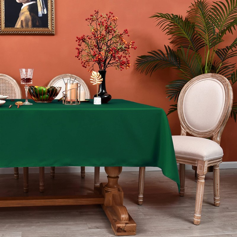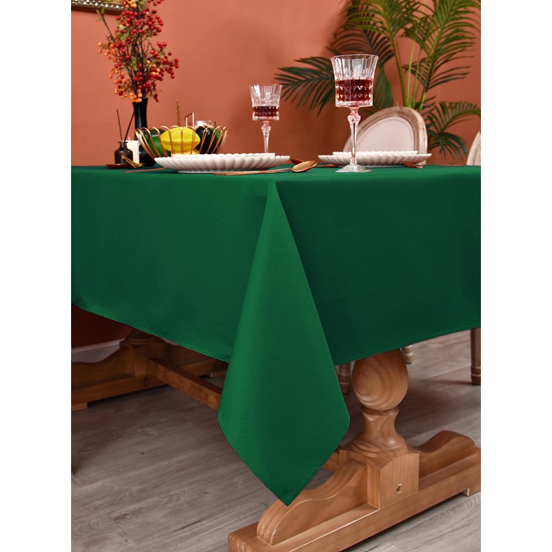 - 2 PACK & HEAVY DUTY WATERPROOF POLYESTER: MEANMOY tablecloth is constructed on a hydraulic loom from 210 GSM (a measure of the weight and thickness of the fabric) spun polyester with water repellent, the result is a tightly woven, water-resistant yet durable smooth textured finish. This dark green microfiber table cover got a thicker texture and higher density, which drives you away from the embarrassment of seeing through. Each package contains two tablecloths