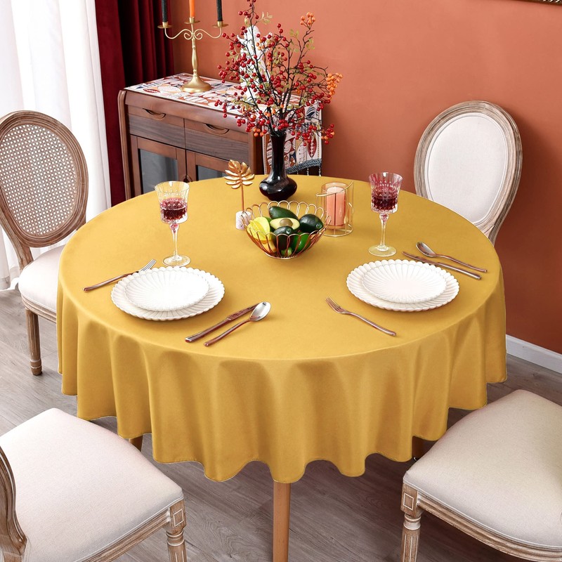 MEANMOY Gold 210 GSM Water & Stain Resistant Round Tablecloth for Circle Table - Solid 90 Inch Table Cloth Cover in Wrinkle Free Durable Washable Polyester Fabric for Wedding, Party, Banquet