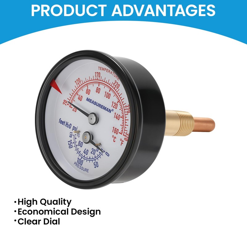 - CLEAR DUAL-SCALE: The 2.5-inch dial simultaneously displays both Pressure (0-75 PSI) and Temperature (60-320°F). Dual-color graphics ensure an intuitive, at-a-glance reading.
