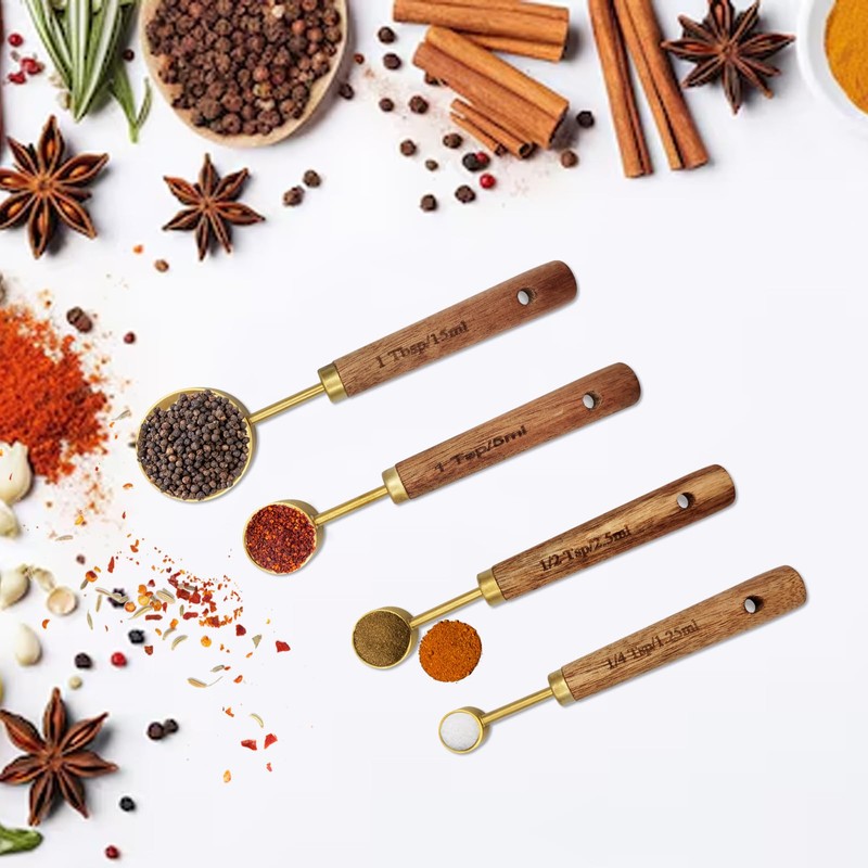 Measuring Cup and Measuring Spoon, Premium Stainless Steel, Pack of 8, Wooden Handle, with Metric and US Dimensions, Dry & Liquid Measuring Cup