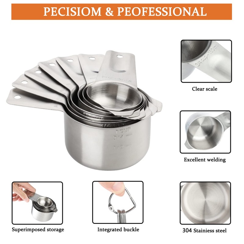 • STAINLESS STEEL MEASURING CUPS SPOONS SET– These 7 cups and 6 spoons are Stainless Steel metal One-piece integrated (no welds) steel design keep it sturdy without break case. They nest fairly tightly ,convenient storage.