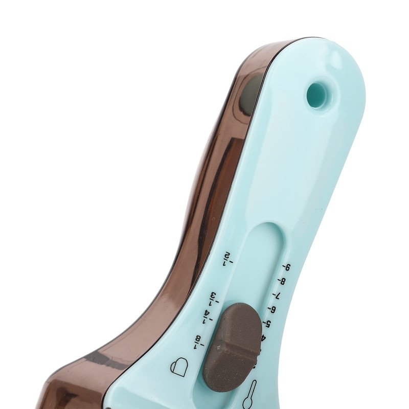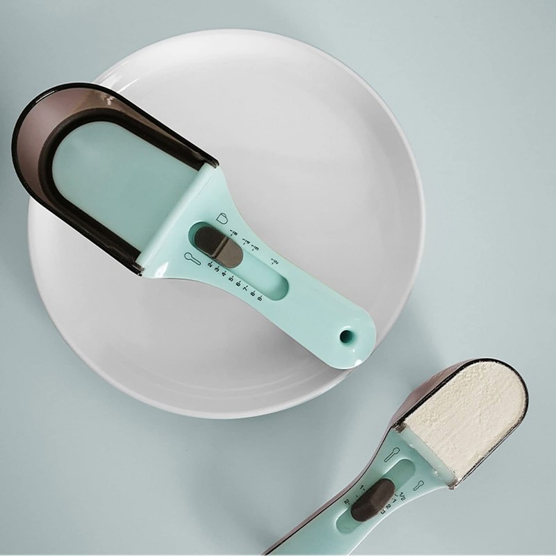 - FEATURES SIMPLE: Our Spoon measuring set has a comfortable and ergonomic handles. Save a tremendous amount of time in measuring cooking ingredients by using just one measurement tool. Gently push the controller, slide cover to desired measurement and cover will click into place, angled makes levelling easy. Very convenient and .