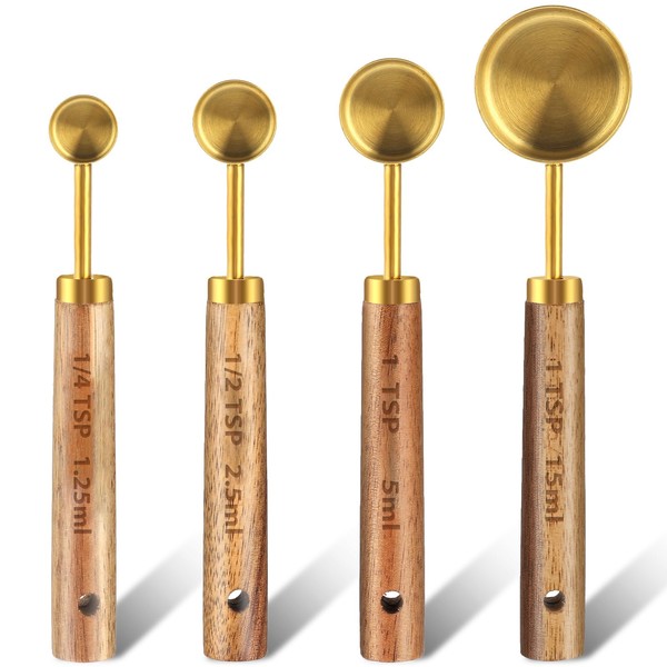 Measuring Spoons Set of 4, Stainless Steel Gold Measuring Cups Measuring Spoon with Wooden Handle Measuring Spoons for Cooking Baking
