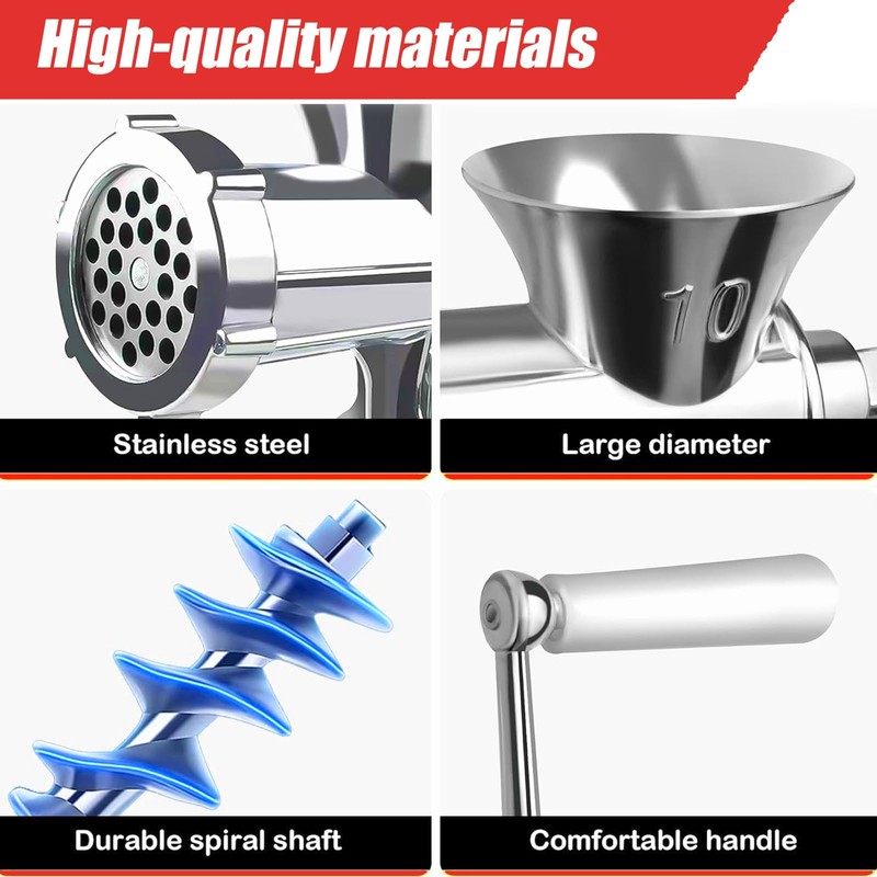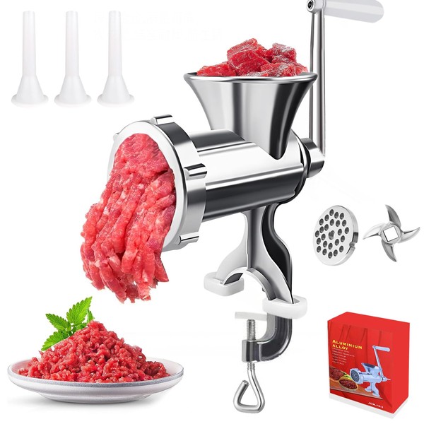 • High Quality Materials - This manual meat grinder is made of aluminum alloy, which not only has good anti-rust and anti-corrosion ability, but also has a beautiful appearance. The blade of the meat grinder is made of forged stainless steel, which is sharp and sturdy. The propeller shaft is made of aluminum alloy, which is strong and sturdy to avoid slippage and improve work efficiency meat grinder.