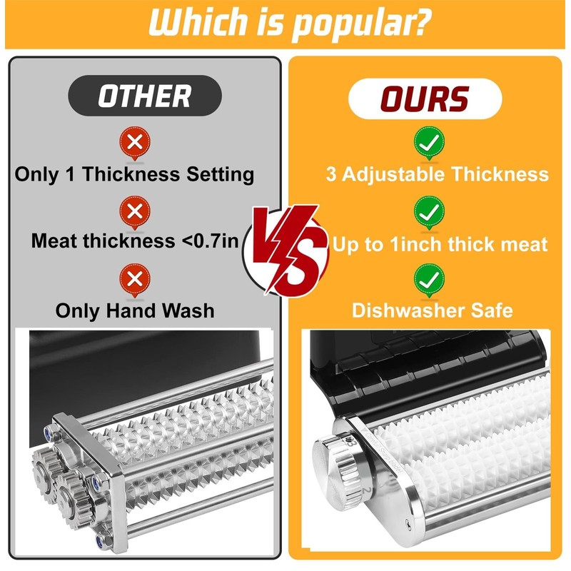 3 Adjustable Thickness- First one to make tenderizer attachment with adjustable thickness, 3 Setting for different thickness meat tenderizing.