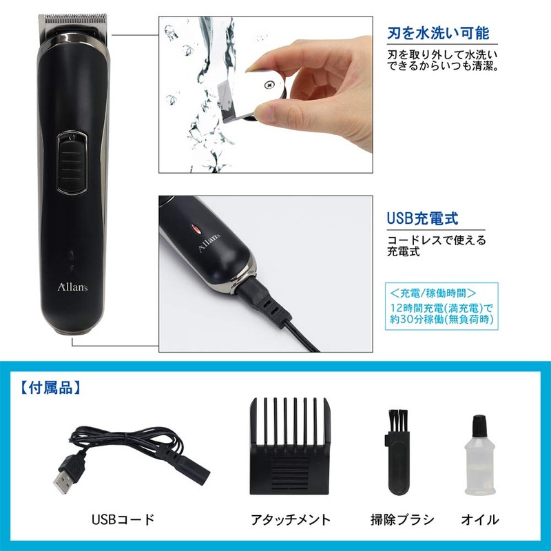 - Dimensions (W x D x H): Approx. 1.4 x 1.4 x 6.1 inches (3.5 x 3.5 x 15.5 cm); Weight: Approx. 4.3 oz (110 g); Material: ABS PC POM; Power Method: Rechargeable (USB cord included); Built-in rechargeable battery: 1.2 V 600 mAh; Charging Time: Approx. 30 minutes (non-load); Set Includes: Mini clipper, USB cord, cleaning brush, oil