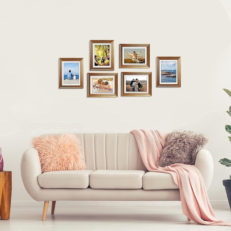 • Versatile Display: One wall gold picture frame fits 5x7 frame with mat, 6x8 frame without mat. It can be placed on tabletop in portrait or landscape orientation. It also can be hung on the wall vertically or horizontally.