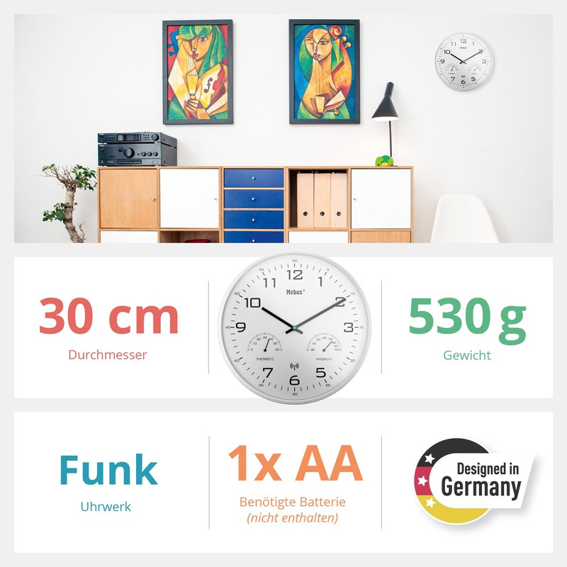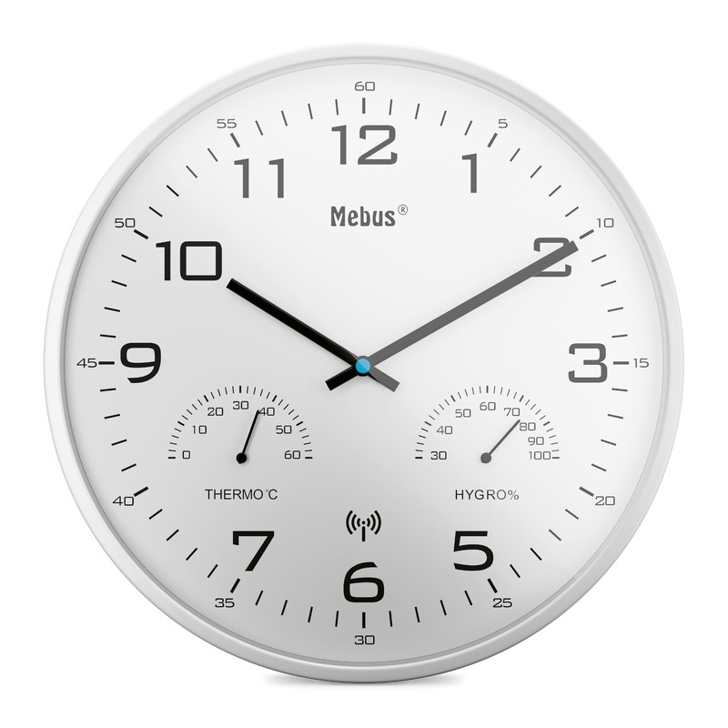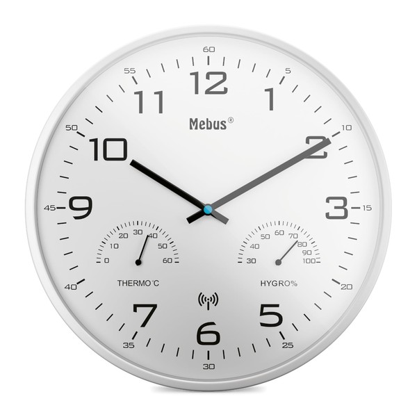 Mebus Modern Radio Wall Clock with Temperature Display and Humidity, 30 cm, Radio-Controlled Clock, Living Room, Kitchen Clock, Model: 52841, Colour: White