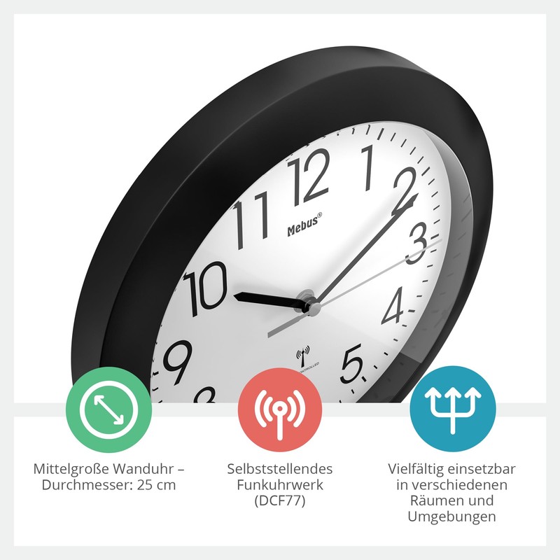 Mebus Radio Controlled Wall Clock with Black Frame Diameter, 25 cm Durchmesser