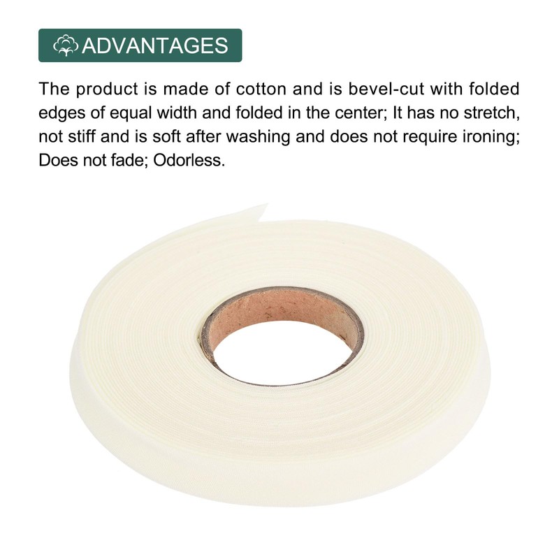 The product is made of polyester and is bevel-cut with folded edges of equal width and folded in the center; It has no stretch, so it is not an elastic band and is suitable for sewing;The product is not stiff and is soft after washing and does not require ironing; Does not fade; Machine and hand washable; Odorless.
