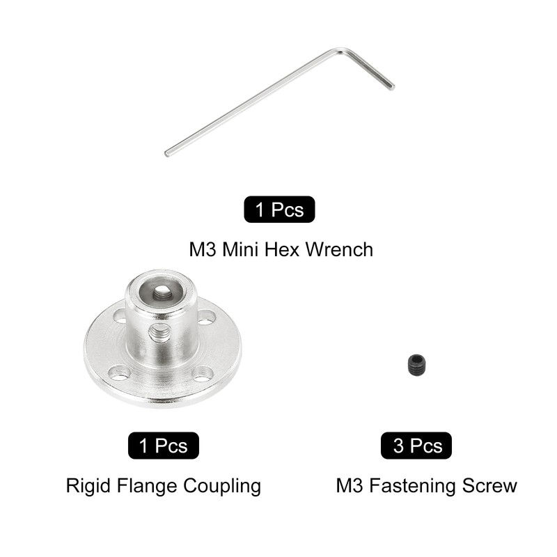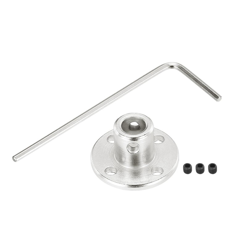 - Product Name: Flange Shaft Coupling;Color: Silver Tone;Material: 45# steel;Inner Diameter: 6mm/0.24 inch;Cylinder Outer Diameter: 10mm/0.39 inch;Base Plate Diameter: 22mm/0.87 inch;Base Plate Height: 2mm/0.08 inch;Cylinder Height:10mm/0.39 inch;Base Hole Distance:16mm/0.63 inch;Screw Holding Degree: 180;Package Content:1 Pcs x Rigid Flange Coupling;1 Pcs x M3 Mini Hex Wrench;3 Pcs x M3 Fastening Screw;