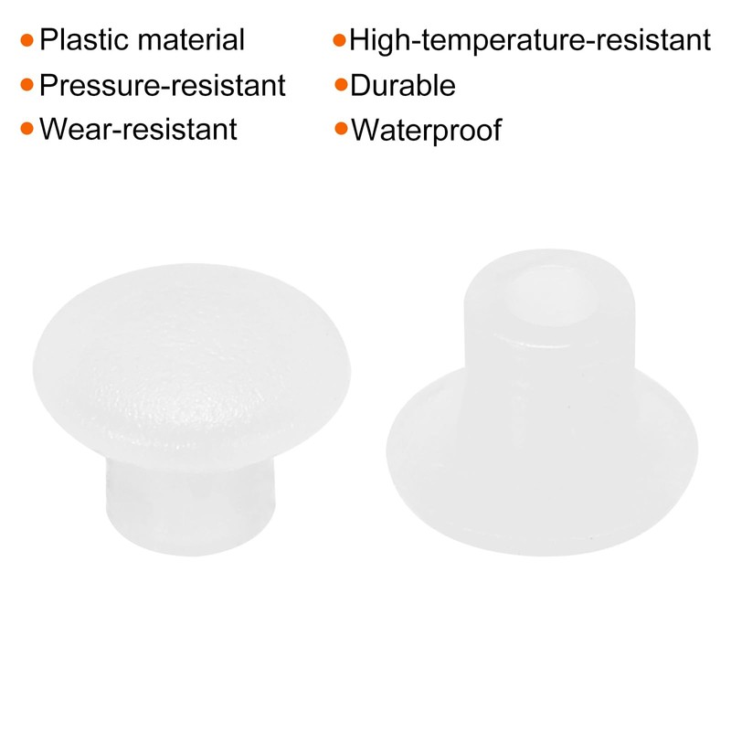 - Mount Hole Diameter: 5 mm (3/16 Inch); Total Height: 5.7 mm (7/32 Inch); Plug Head Diameter: 8.5 mm (0.33 Inch); Color: Clear White; Material:Plastic; In the package of: 100 x Hole Plugs