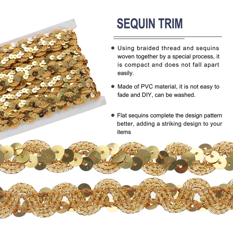 - The sequin trim is made of braided thread and sequins are woven together by a special process, compact, and not easy to fall apart. Made of PVC material, it is not easy to fade and DIY, can be washed.