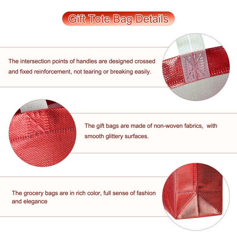 - The gift bags are made of non-woven fabrics, with smooth glittery surfaces, suitable for weddings, birthday parties, Christmas, or home decorations, to store present boxes, or as shopping bags.