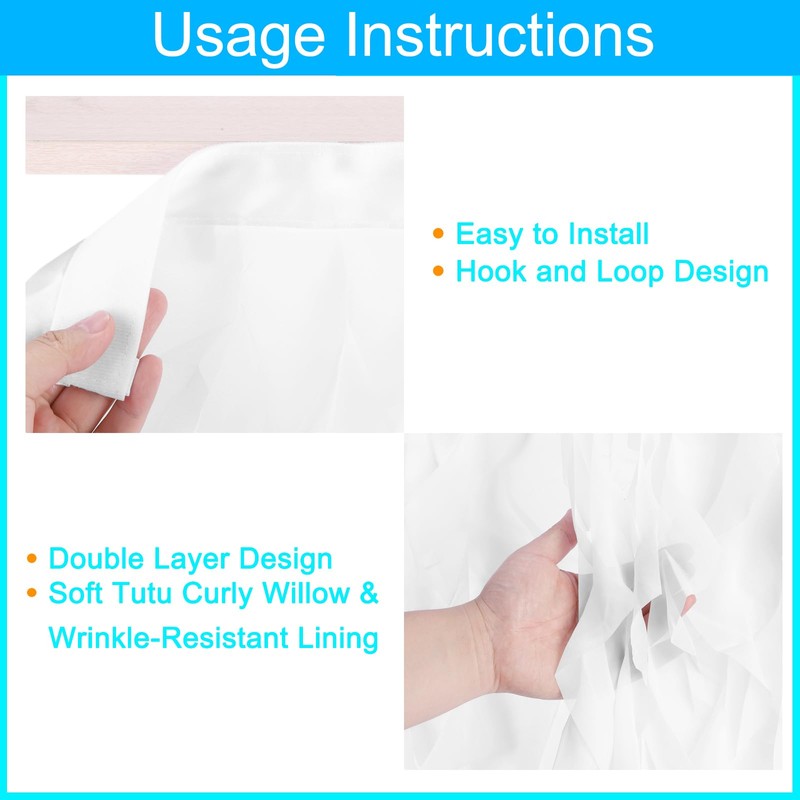- This table skirt is very easy to install, the package contains a hook and loop, you just need to stick the hook and loop to the edge of the table, and then fit it with the hook and loop on the table skirt.