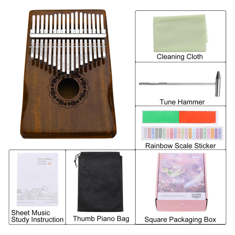 In the package of: 1 x Thumb Piano, 1 x Velvet Protective Bag, 1 x Sheet Music Study Instruction, 1 x Tune Hammer, 1 x Cleaning Cloth, 1 x Rainbow Scale Sticker, 1 x Square Packaging Box