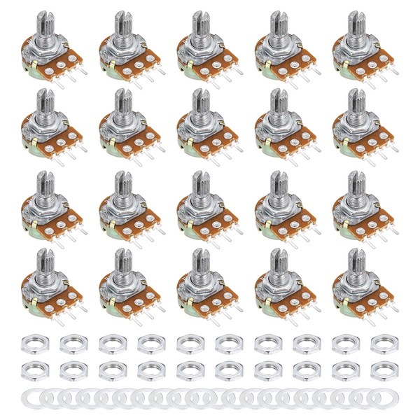 - Terminal: 3 Pin; Resistance Value: B100k Ohm(Tolerance±20%); Thread Diameter: 7mm/0.27 inch; Shaft Size: 6mm x 8.8mm/0.23 inch x 0.35 inch(D*L); Total Length: 24mm/0.94 inch; Package includes: 20 x Potentiometer