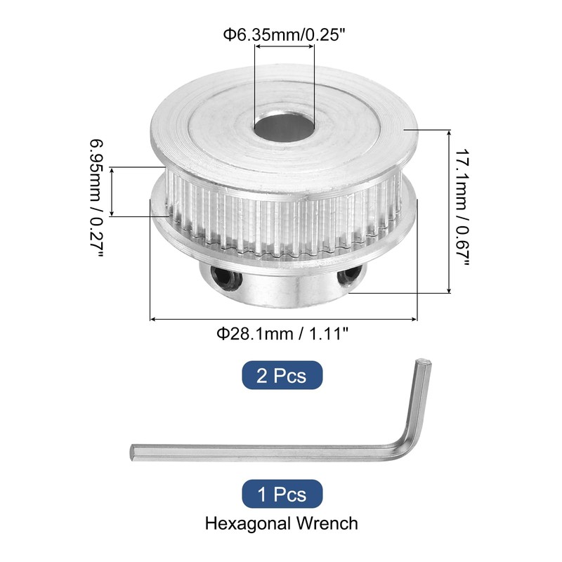 Package Content: 2 Pcs x Timing Pulley with Hexagonal Wrench; Number of Teeth: 40; Shaft Hole Diameter: 6.35mm/0.25inch; Maximum Outer Diameter: 28.1mm/1.11inch; Overall Height: 17.1mm/0.67inch; Slot Width: 6.95mm/0.27inch