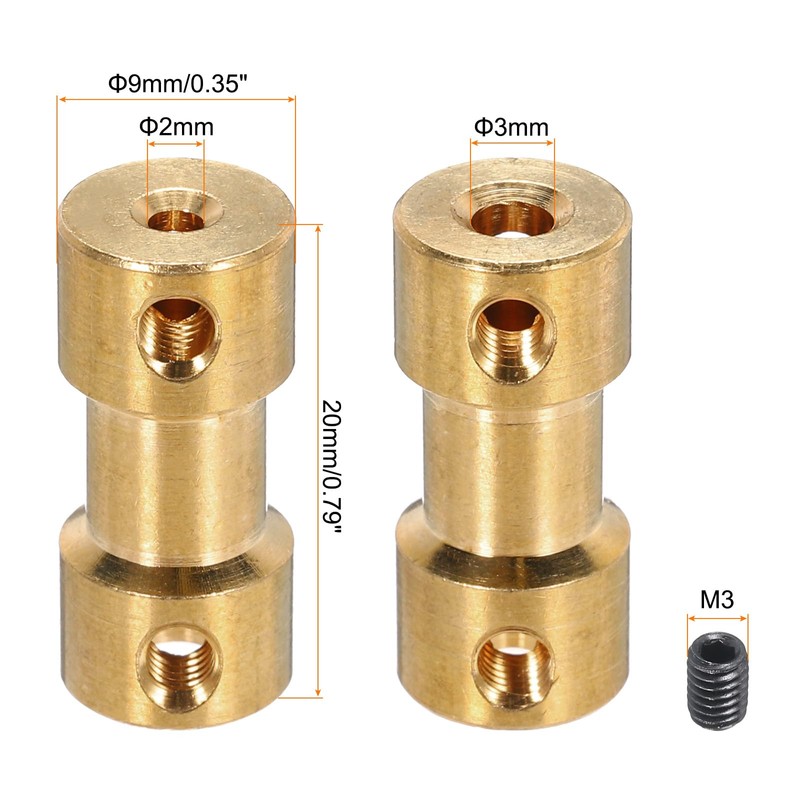 - Connection Bore Diameter: 2mm to 3mm; Screw Thread Size: M3*0.5; Total Length: 20mm /0.79-inch; Outside Diameter: 9mm/0.35-inch; Material: Brass; In the package of: 1 Set x Rigid Coupling (Include 8pcs Coupling + 32pcs Screws + 2pcs Wrench)