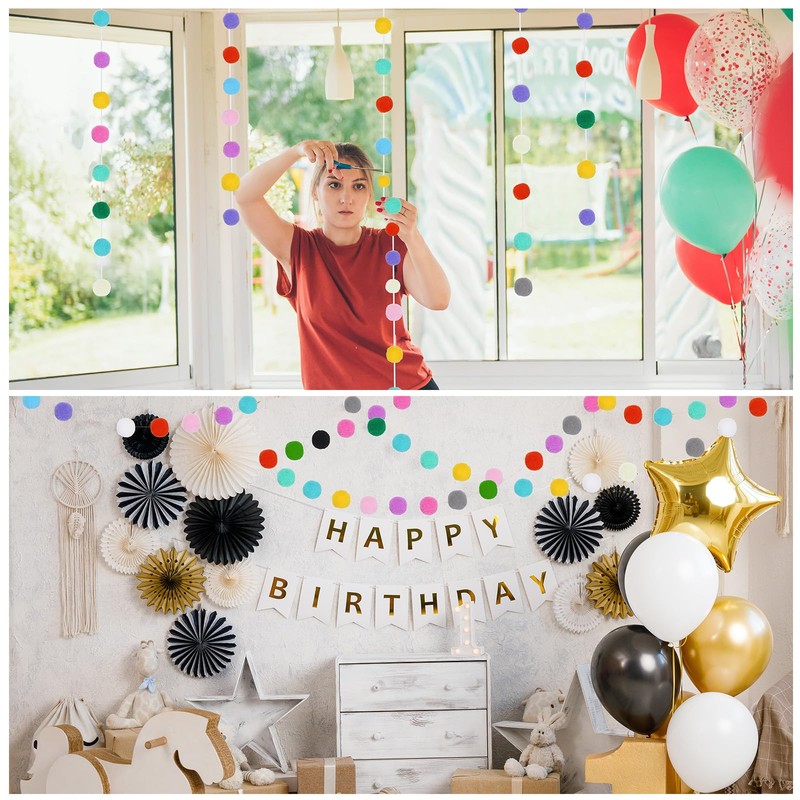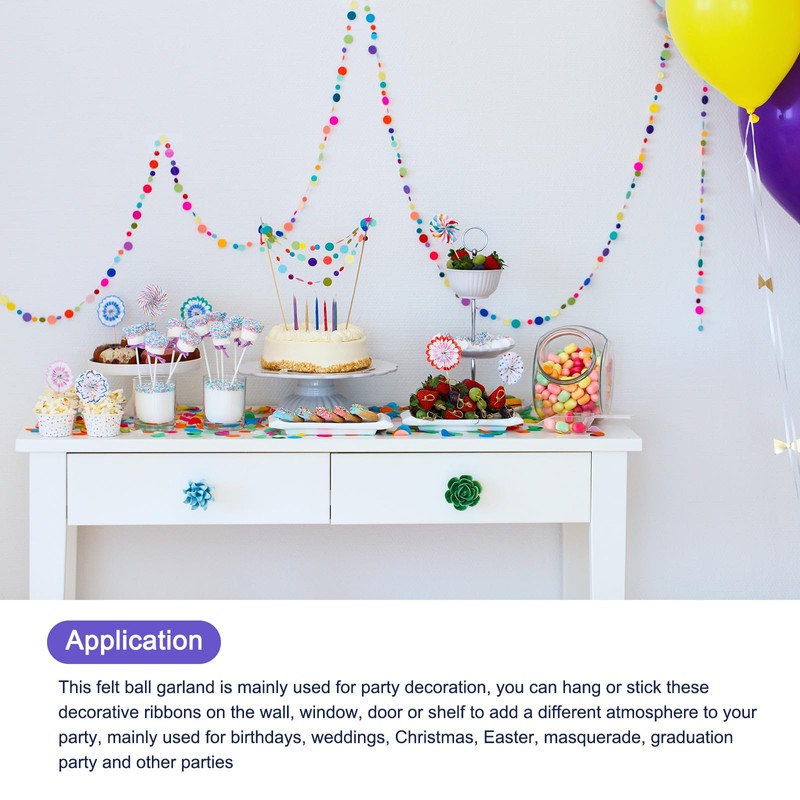 - This felt ball garland is mainly used for party decoration, you can hang or stick these decorative ribbons on the wall, window, door or shelf to add a different atmosphere to your party, mainly used for birthdays, weddings, Christmas, Easter, masquerade, graduation party and other parties