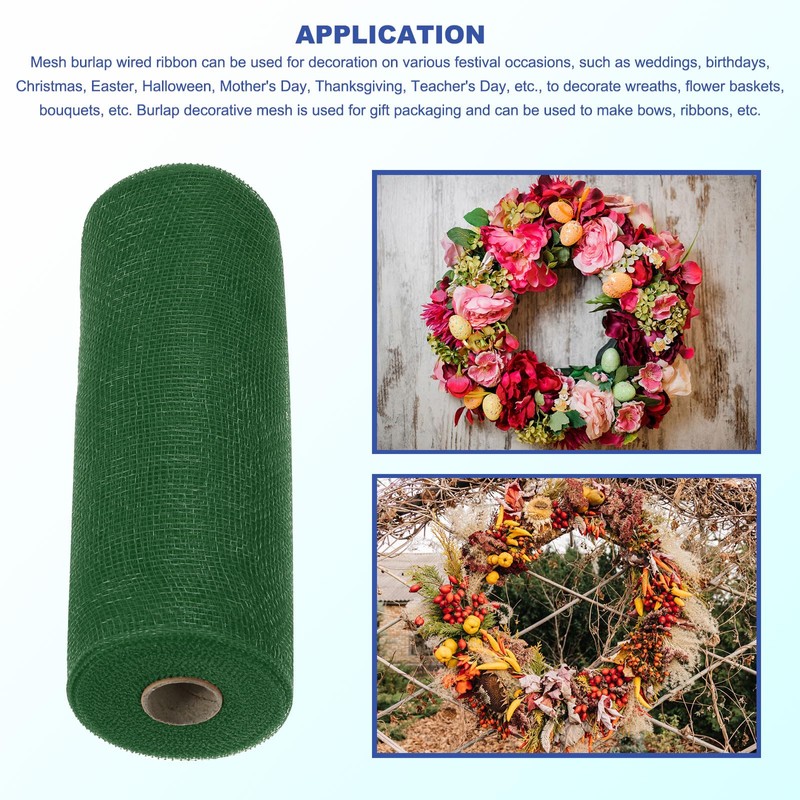 - Poly burlap mesh decorative mesh ribbon roll, applied to decorative flower mesh and gift wrapping. Mesh burlap wired ribbon can be used for decoration on various festival occasions, such as weddings, birthdays, Christmas, Easter, Halloween, Mother's Day, Thanksgiving, Teacher's Day, Anniversary, Engagement, Father's Day, New Year, Valentine's Day,etc., to decorate wreaths, flower baskets, bouquets, etc. Burlap decorative mesh is used for gift packaging and can be used to make bows, ribbons, etc.