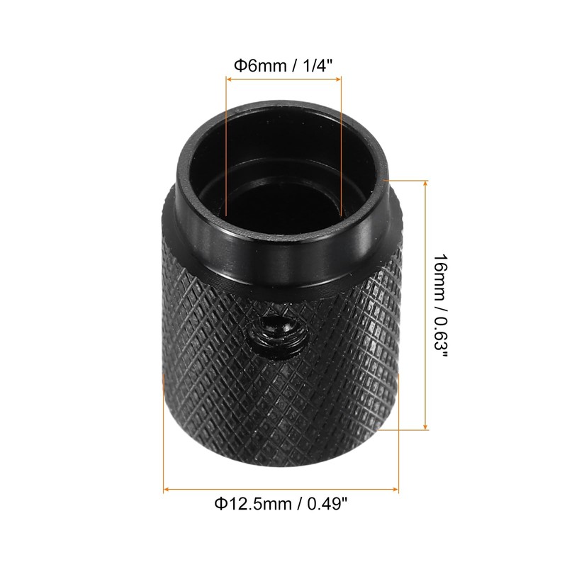 - Aluminium Alloy Potentiometer Knob: Size: 12.5 x 16 mm / 0.49 x 0.63 inch (OD x H); Material: Aluminium Alloy; Mounting Hole Dia: 6mm / 1/4 inch; Color: Bright Black;