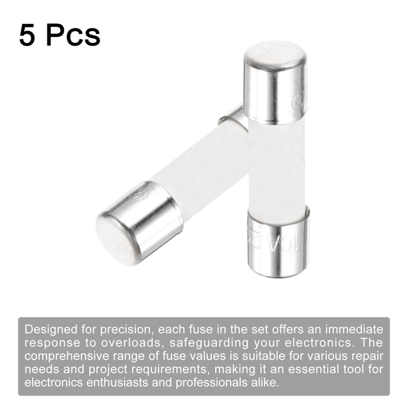 - Material: Ceramic; Body Size: 5mm x 20mm / 0.2" x 0.8" (D*L); Rated Operational Voltage (Ue): 250V; Rated Operational Current (Ie): 10A; Package List: 5 x PCS Ceramic Time Delay Fuse