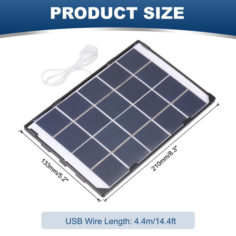 - Polycrystalline Solar Panels, Size: 133 x 210mm/5.2 x 8.3 inch (L*W); USB Wire Length: 4.4m/14.4ft; Power: 6W; Voltage: 5V; Current: 1.2A; In the Package: 1 x Mini Solar Panels