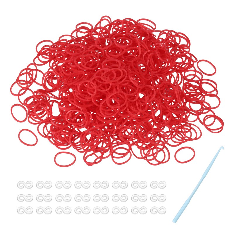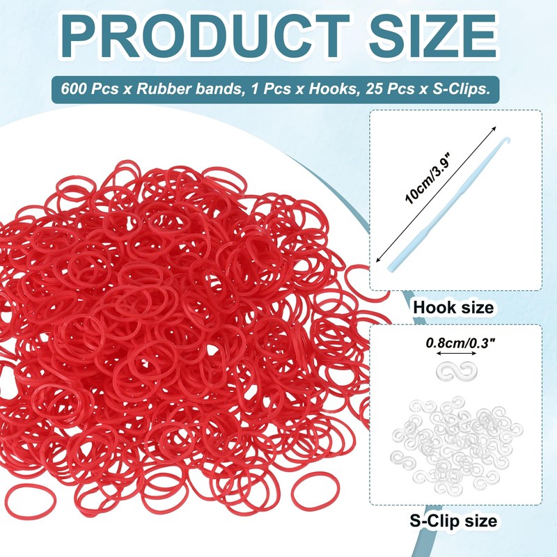 - The loom rubber band kits, we provide here, are in the sizes of: Hook Length: 10cm/3.9 Inch; S-Clip Length: 0.8cm/0.3 Inch; Material: Rubber; Color: Red; In the package of: 600 Pcs x Rubber bands, 1 Pcs x Hooks, 25 Pcs x S-Clips.