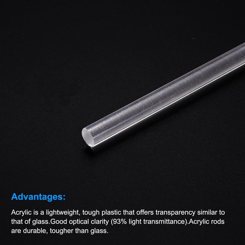 - ADVANTAGES - Acrylic rods are durable, tougher than glass. is a glass substitute material that is often used frequently.Good optical clarity (93% light transmittance).High strength and rigidity, surface can be polished, high transparency, heat resistance.Large processing plasticity, can be processed into products of various desired shapes