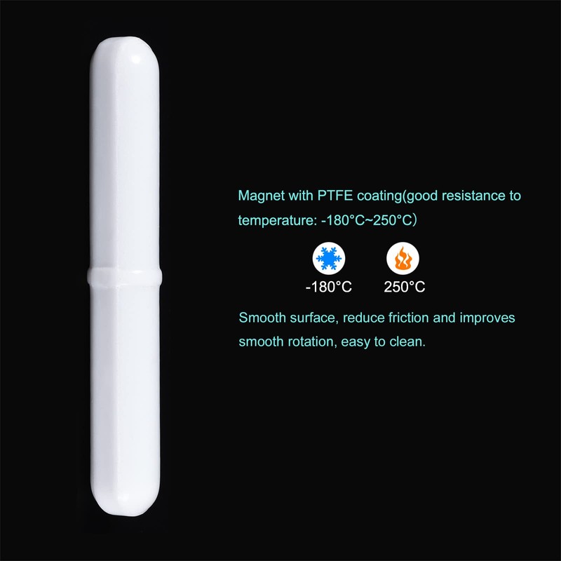 - La barra de agitación magnética está hecha de un imán con recubrimiento de PTFE, el recubrimiento soporta la corrosión y tiene buena resistencia a altas temperaturas (rango de tolerancia de temperatura: -180 ℃ ~ 250 ℃)