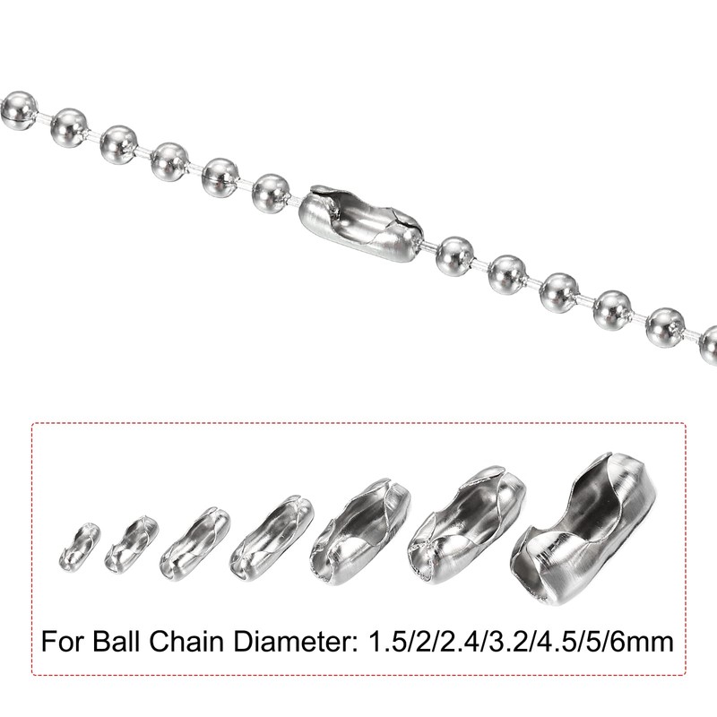 - Fit for Ball Chain Diameter: 1.5/2/2.4/3.2/4.5/5/6mm; Ball chain clasp length: 6,7,9,11,13,15,17.5mm / 0.24",0.28",0.35",0.43",0.59",0.69"; Material: Stainless Steel; Color: Silver; Packing List: 100 × 1.5mm Ball Chains Clasps, 50 × 2mm Ball Chains Clasps, 30 × 2.4mm Ball Chains Clasps, 20 × 3.2mm Ball Chains Clasps, 10 × 4.5mm Ball Chains Clasps, 10 x 5mm Ball Chains Clasps, 10 x 6mm Ball Chains Clasps.