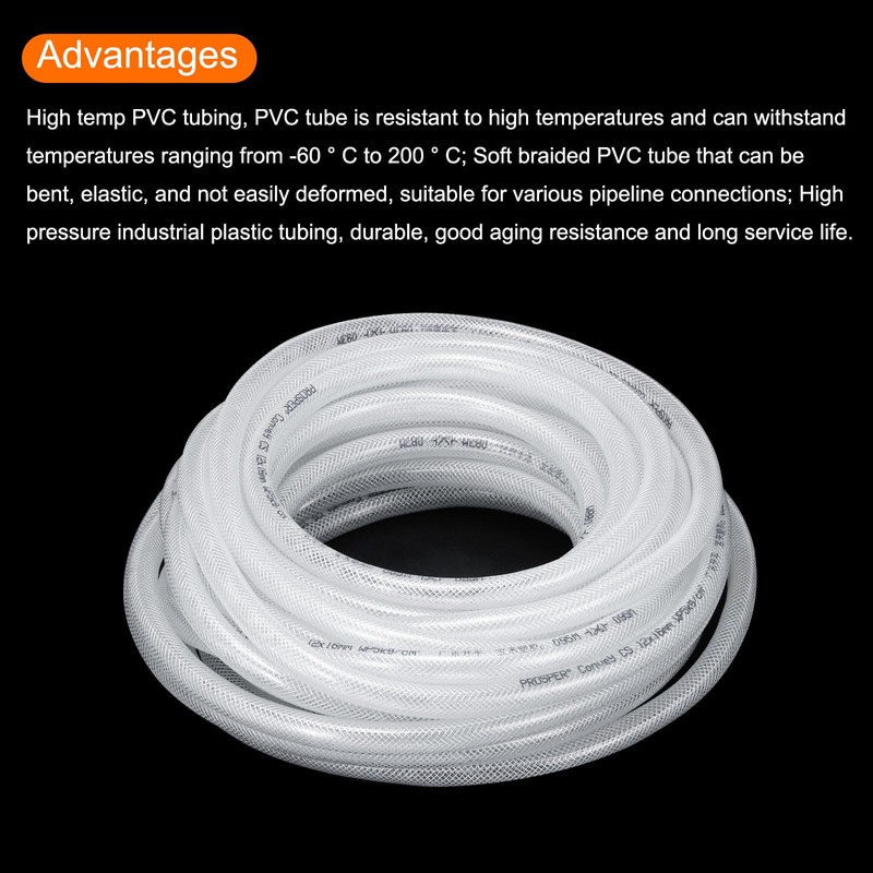 High temp PVC tubing, PVC tube is resistant to high temperatures and can withstand temperatures ranging from -60 ° C to 200 ° C; Soft braided PVC tube that can be bent, elastic, and not easily deformed, suitable for various pipeline connections; High pressure industrial plastic tubing, durable, good aging resistance and long service life; PVC tube can be used as beer line tubing, water hose, aquarium tube, fish tank tubing, pump tubing, irrigation tubing