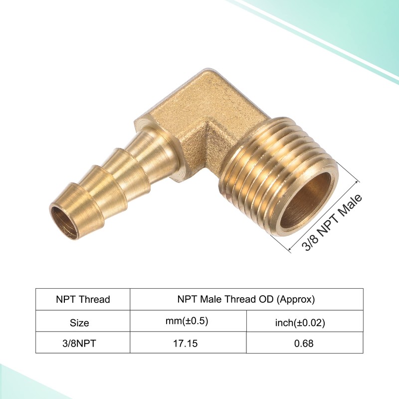 - Thread Size: 3/8 NPT Male; Barb OD: 9mm / 5/16 inch; Elbow Size: 40x31x17mm / 1.57x1.22x0.67 inch (L*W*H); 304 Stainless Steel Clamp ID: 6-12mm / 0.24-0.47 inch