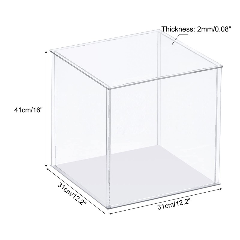 - Pack of 1 Acrylic Display Case; Internal Size(LxWxT): 30x30x40cm/11.8x11.8x15.7inch. External Size: (LxWxT): 31x31x41cm/12.2x12.2x16inch. Clear Board Thickness: 2mm/0.08inch; White Board Thickness: 2mm/0.08inch.