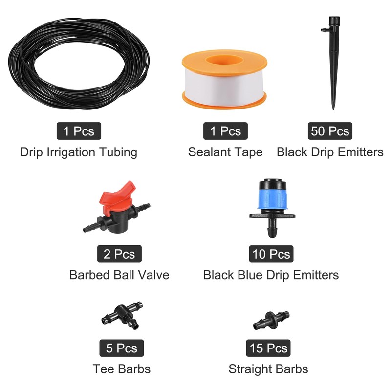 In the package of: 4 x Barbed Ball Valve, 15 x Straight Barb, 5 x Tee Barb, 1 x Drip Irrigation Tubing, 50 x Black Drip Emitter, 10 x Black Blue Drip Emitter, 1 x Sealant Tape
