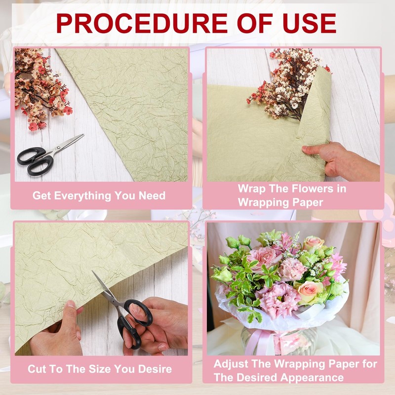 - The bouquet wrapping paper has a unique texture and feel, which allows it to form a natural wrinkled effect when wrapping bouquets. It can be cut or adjusted according to different shapes and sizes. It's Waterproof and Multiple colors are available, and packaging with wrinkle paper of specific colors can create a stronger festive atmosphere for specific holidays or anniversaries.