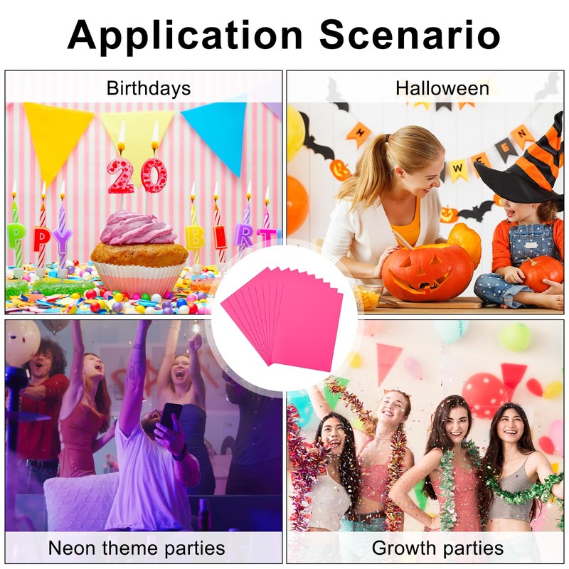 These neon cardstock papers are perfect for DIY, black light glow party dance floor decorations, neon theme parties, birthdays, weddings, growth parties, stage decorations, anniversaries, Halloween, New Year's Eve, carnivals, dance parties and any other joyful events, can be hung on walls, ceilings, trees, tables, also can be used as charming curtains, window decorations in black light rooms.